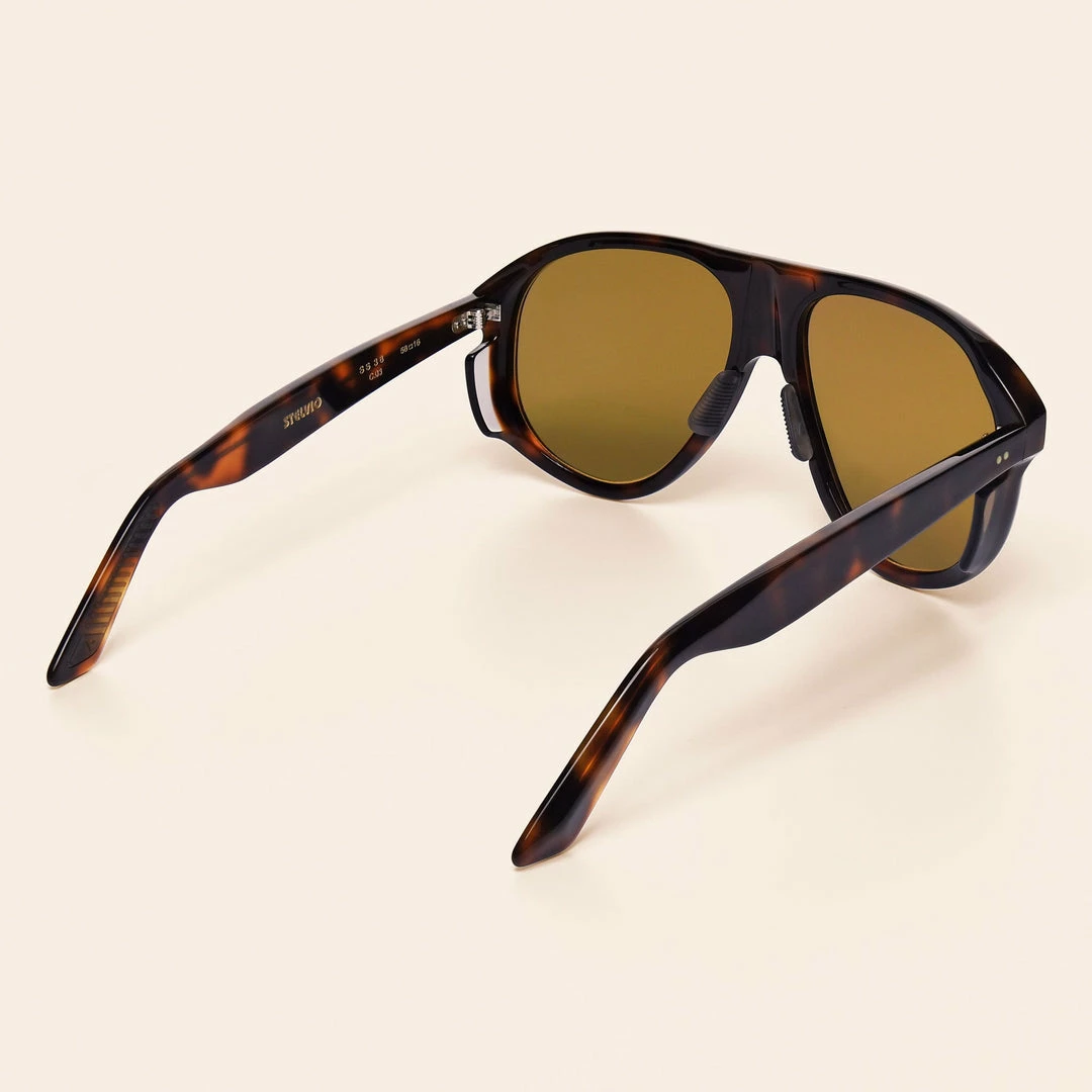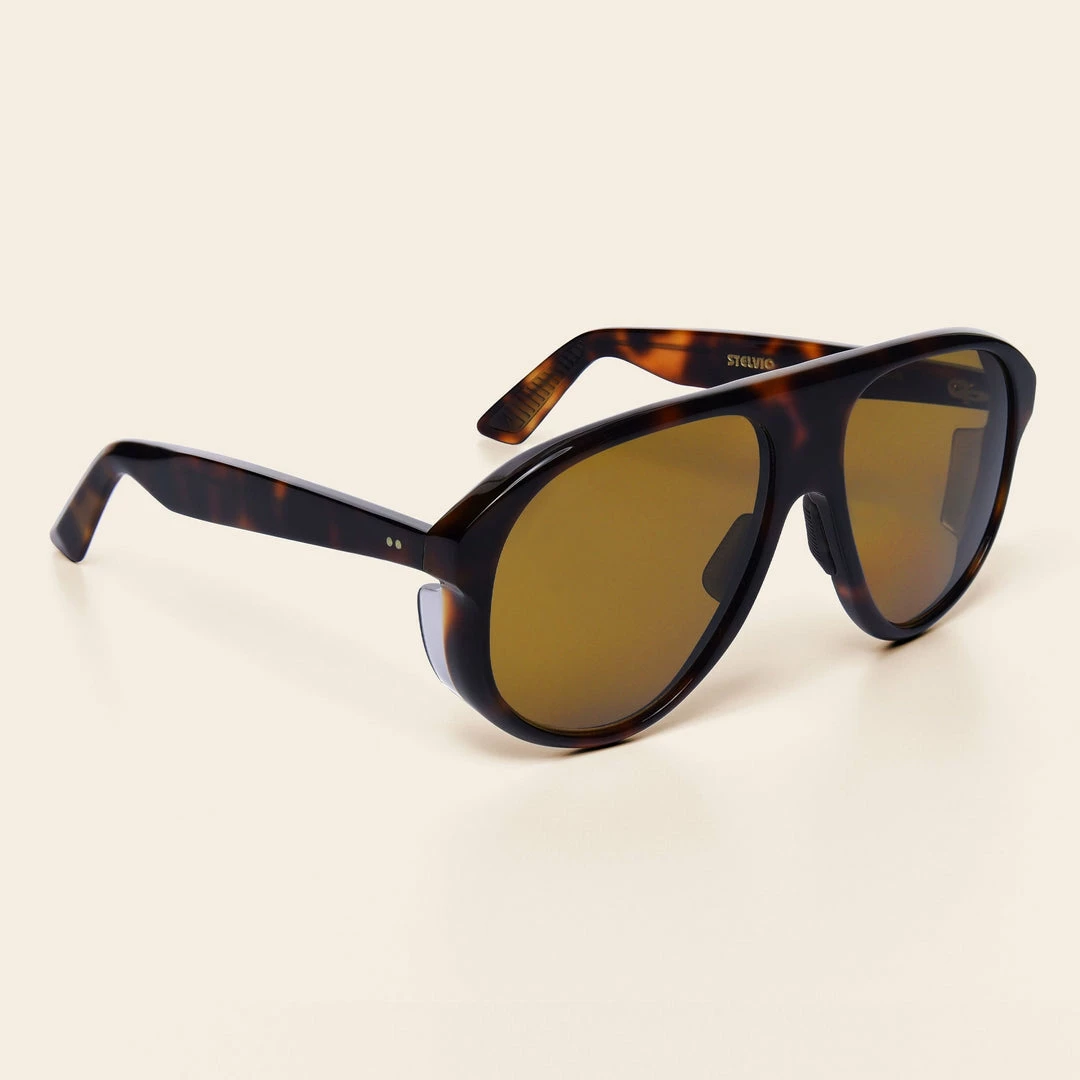 Named after the SS38 Passo dello Stelvio, one of cyclingโs most iconic stretches of road, with its 48 switchbacks climbing to 2758m high in the Italian alps. The Stelvio takes its style cues from the bold, tear drop shaped aviators favoured by motor racing drivers of the 70โs and 80โs.The large lens and raised brow line give greater visual scope and increased protection.
