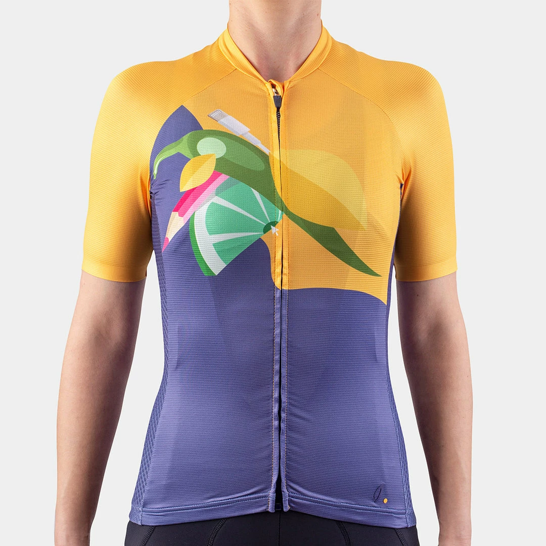 - Bottom hem is equipped with elastic silicone tape made out of 100% recycled Polyamide and Elastane fibers to keep the jersey in place.