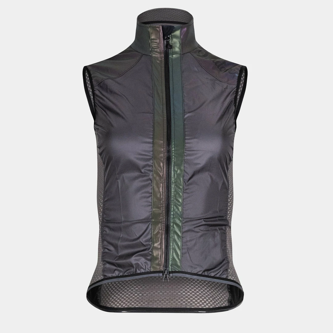 As a versatile addition to our Alternative Line, the Alternative Essential Gilet has been entirely made from 100% recycled materials. Lightweight, the extremely dense weave of the recycled polyester offers the same high level of performance and wind protection as material made from virgin synthetics. Easily packable, its two-way zipper slides effortlessly, which makes ventilating simple, and taking it on or off a cinch. Itโll definitely keep the wind from penetrating to your chest, but the super light, breathable mesh on the back side will prevent overheating or moisture build-up. Using the same high-quality materials as found in the menโs version, this womenโs specific option has been cut to suit the size and shape of women cyclists.