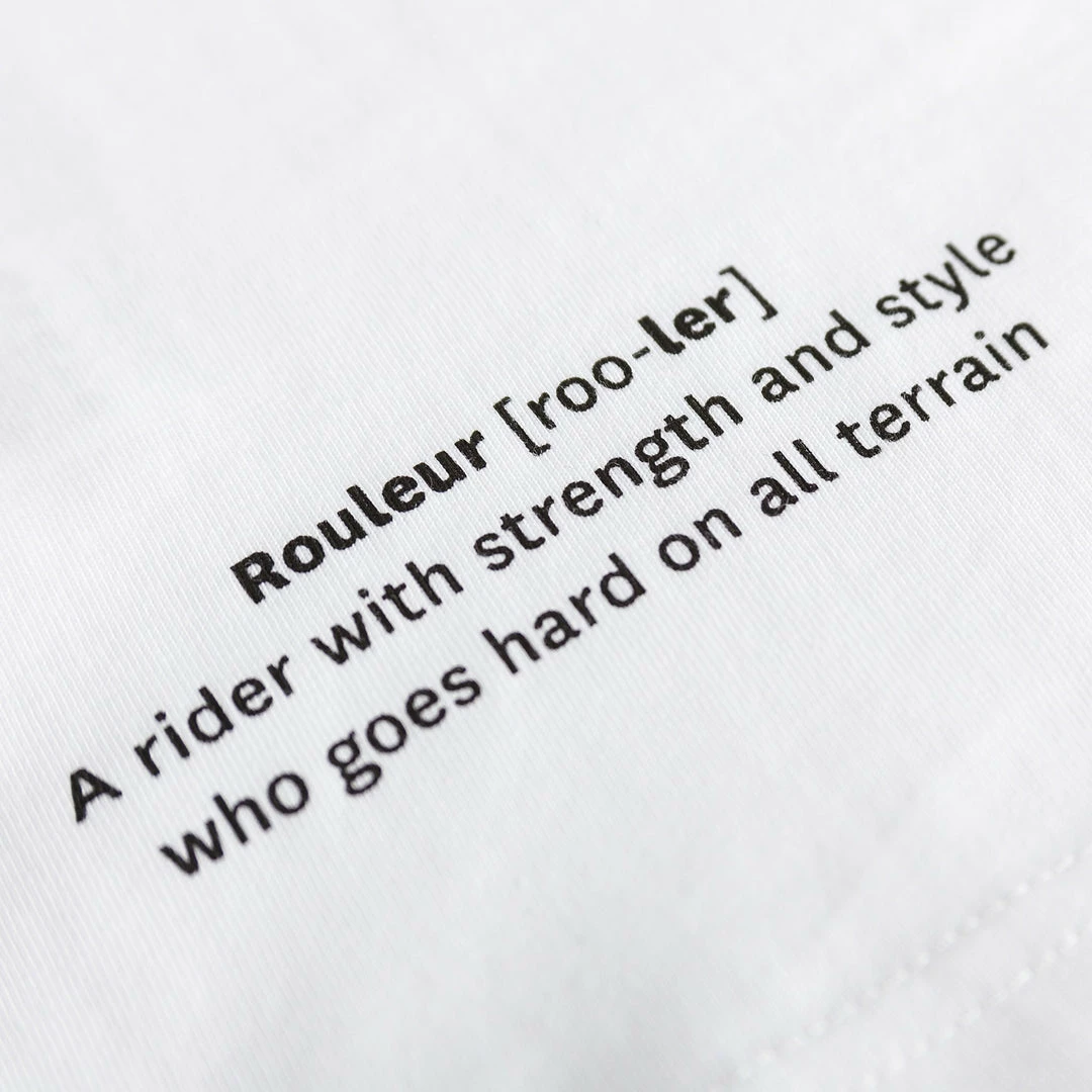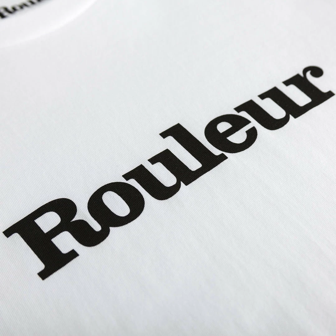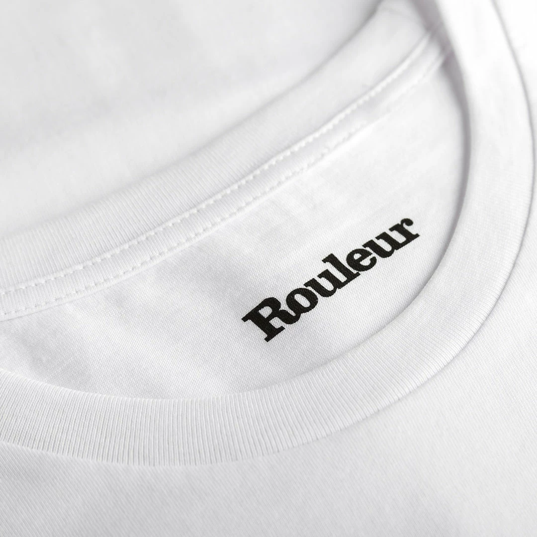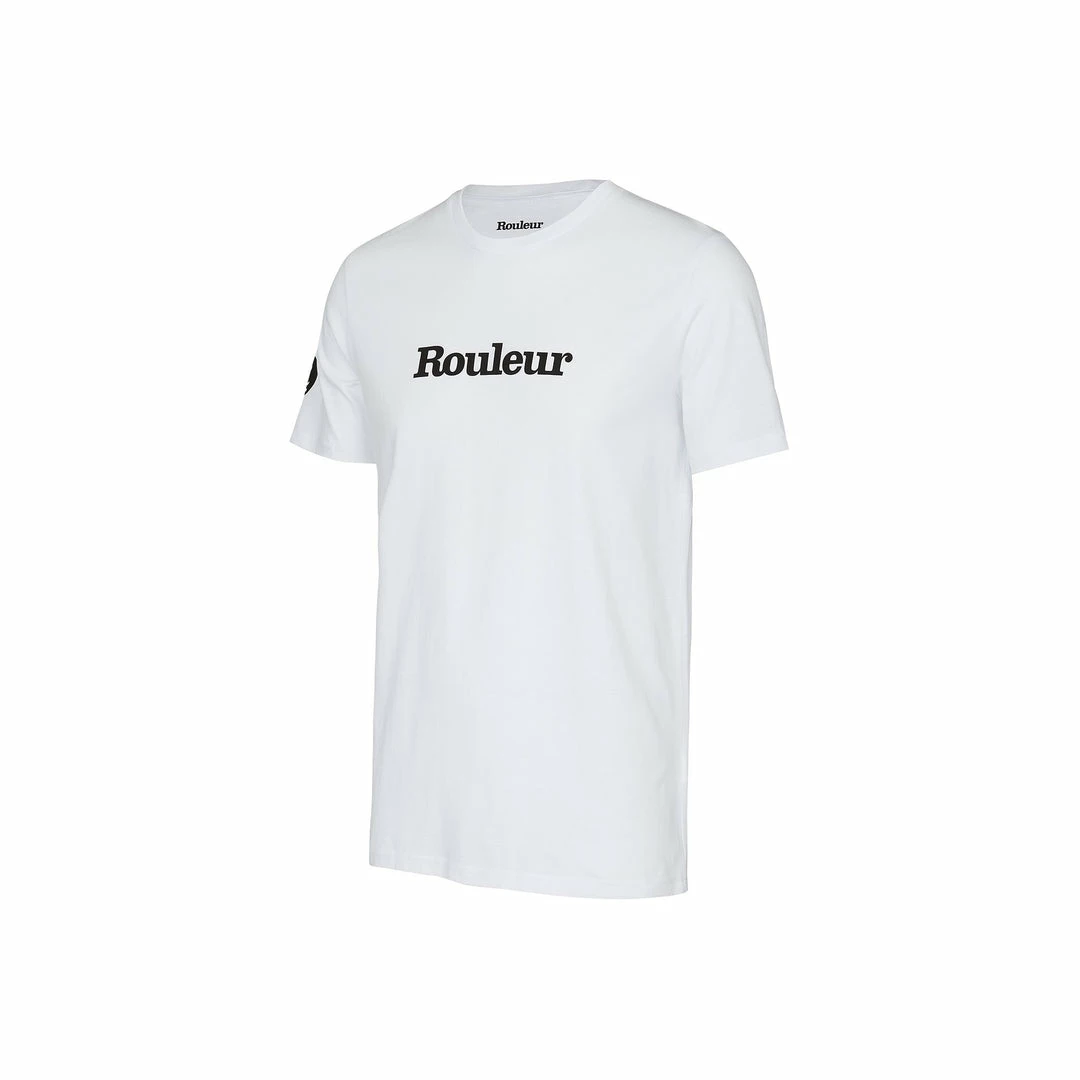 The classic Rouleur logo premium t-shirt in white with a black screen-printed logo on the chest and Rouleur roundel on the arm.