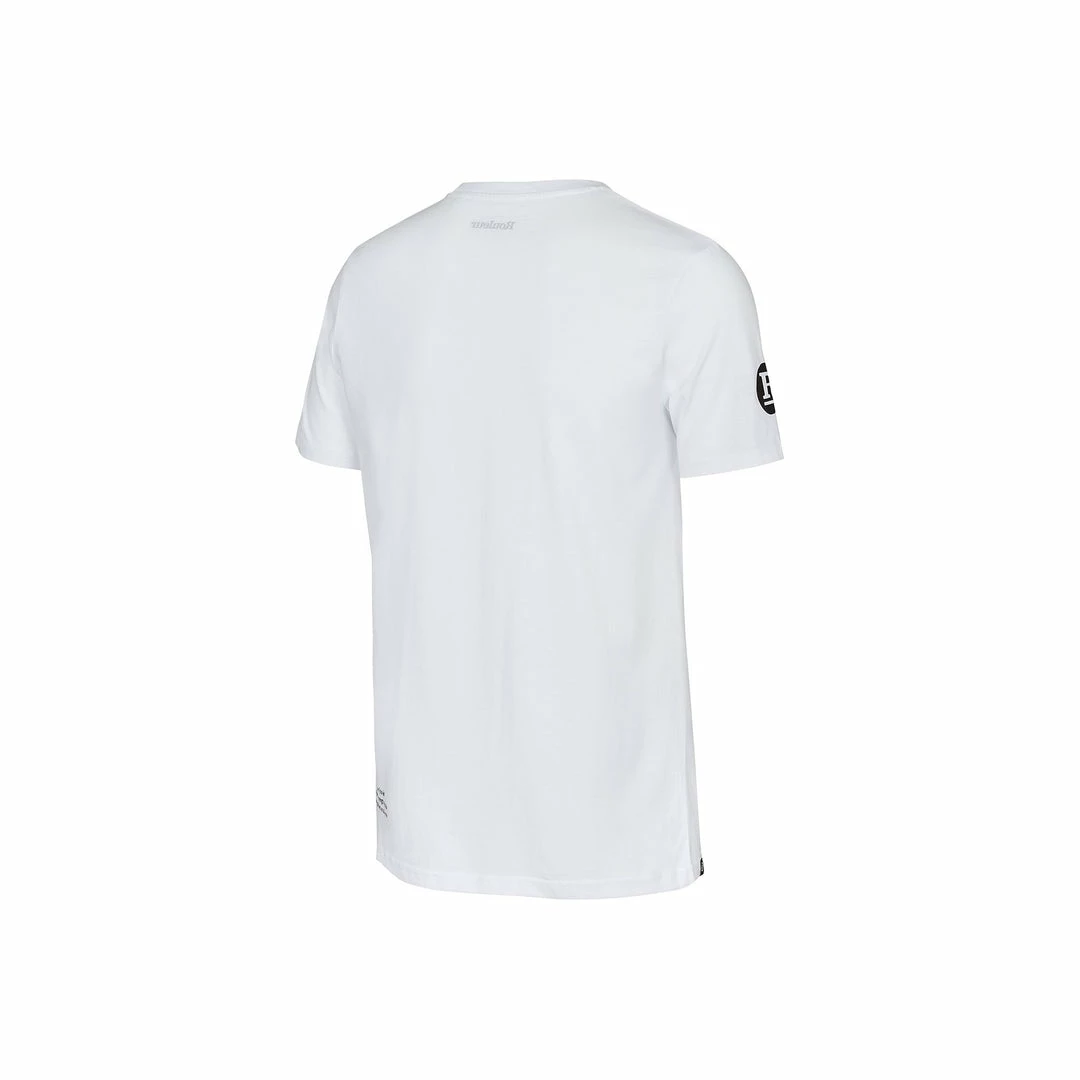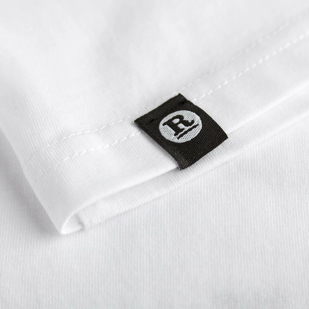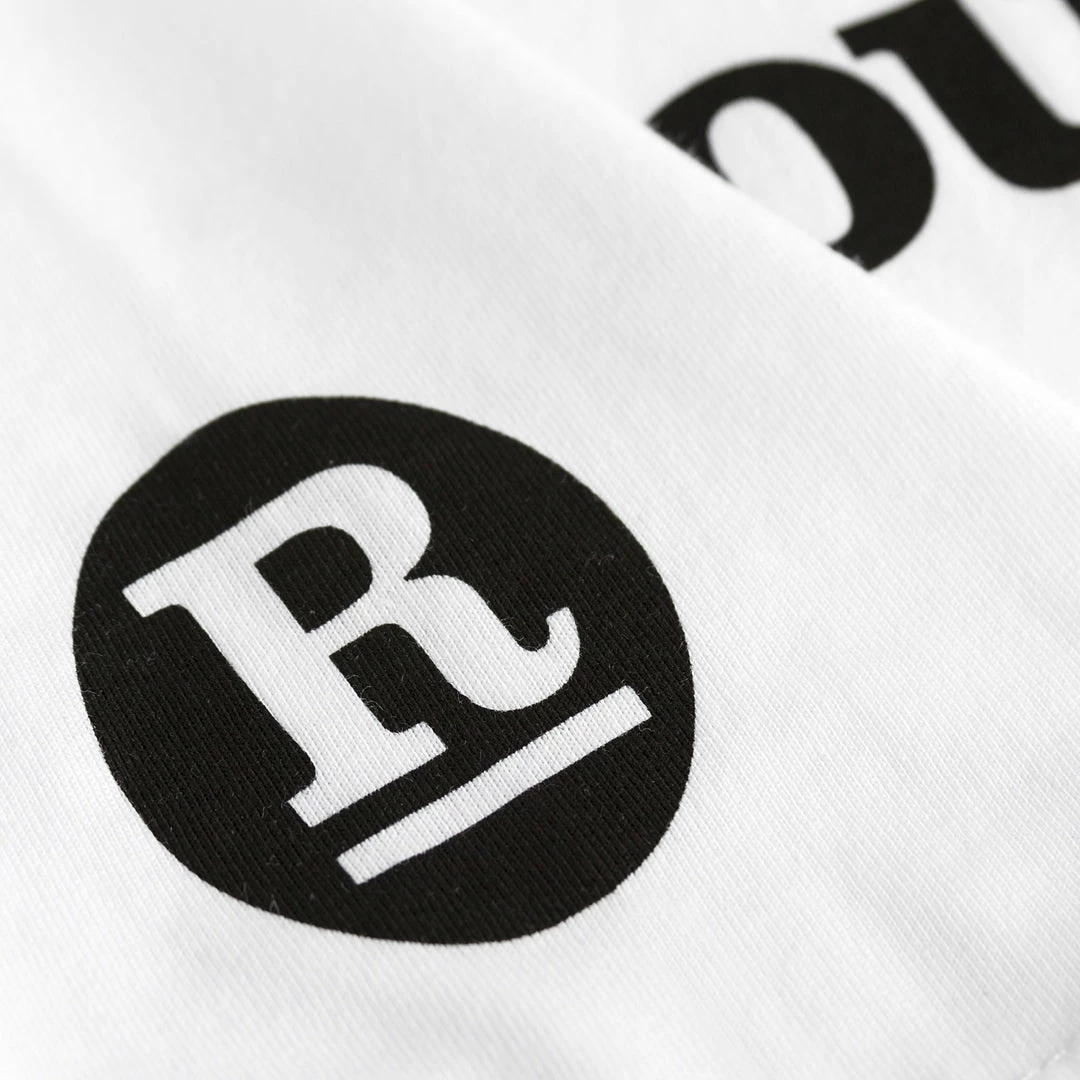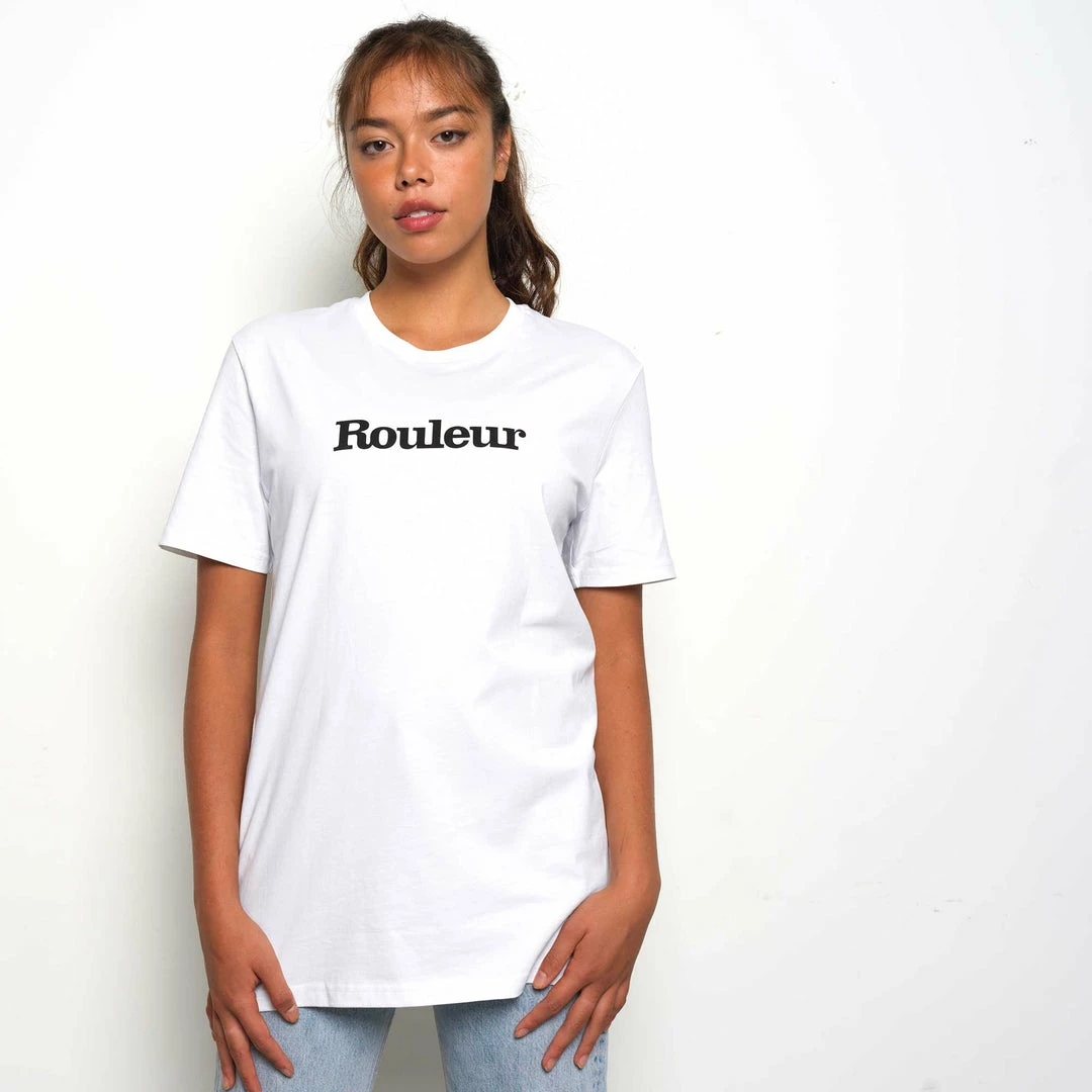 The classic Rouleur logo premium t-shirt in white with a black screen-printed logo on the chest and Rouleur roundel on the arm.