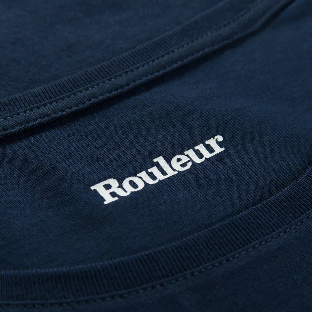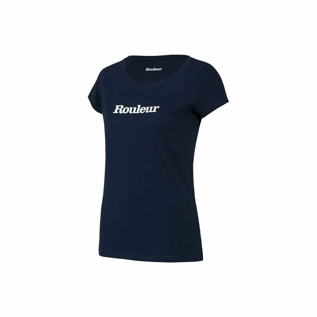 The premium Rouleur logo t-shirt with a female-specific cut. In navy with a white logo. The iconic wordmark is screen printed onto a soft 100% organic cotton t-shirt.