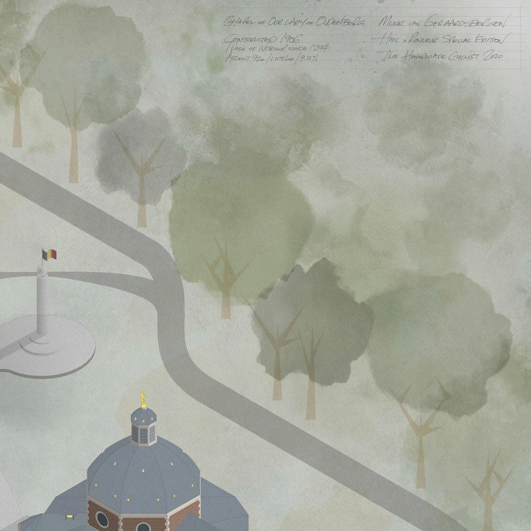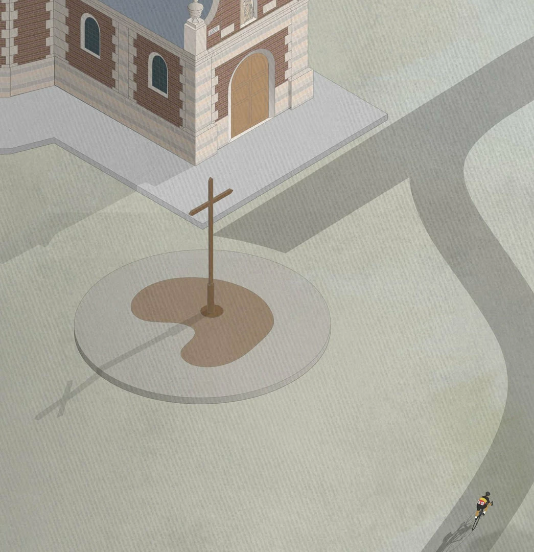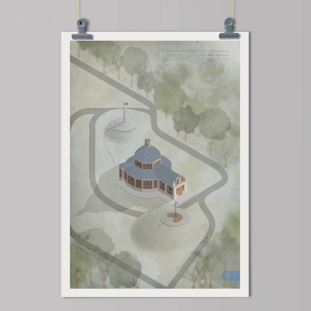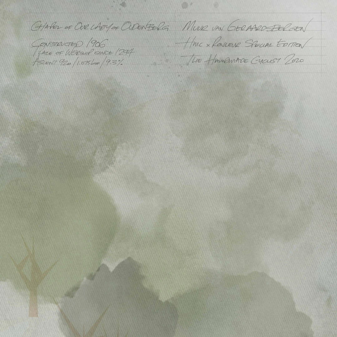 This artwork, produced as an exclusive partnership between the Handmade Cyclist and Rouleur Magazine, features a detailed, architectural isometric projection of the chapel and it’s surroundings, with a subtle, textured, watercolour finish.