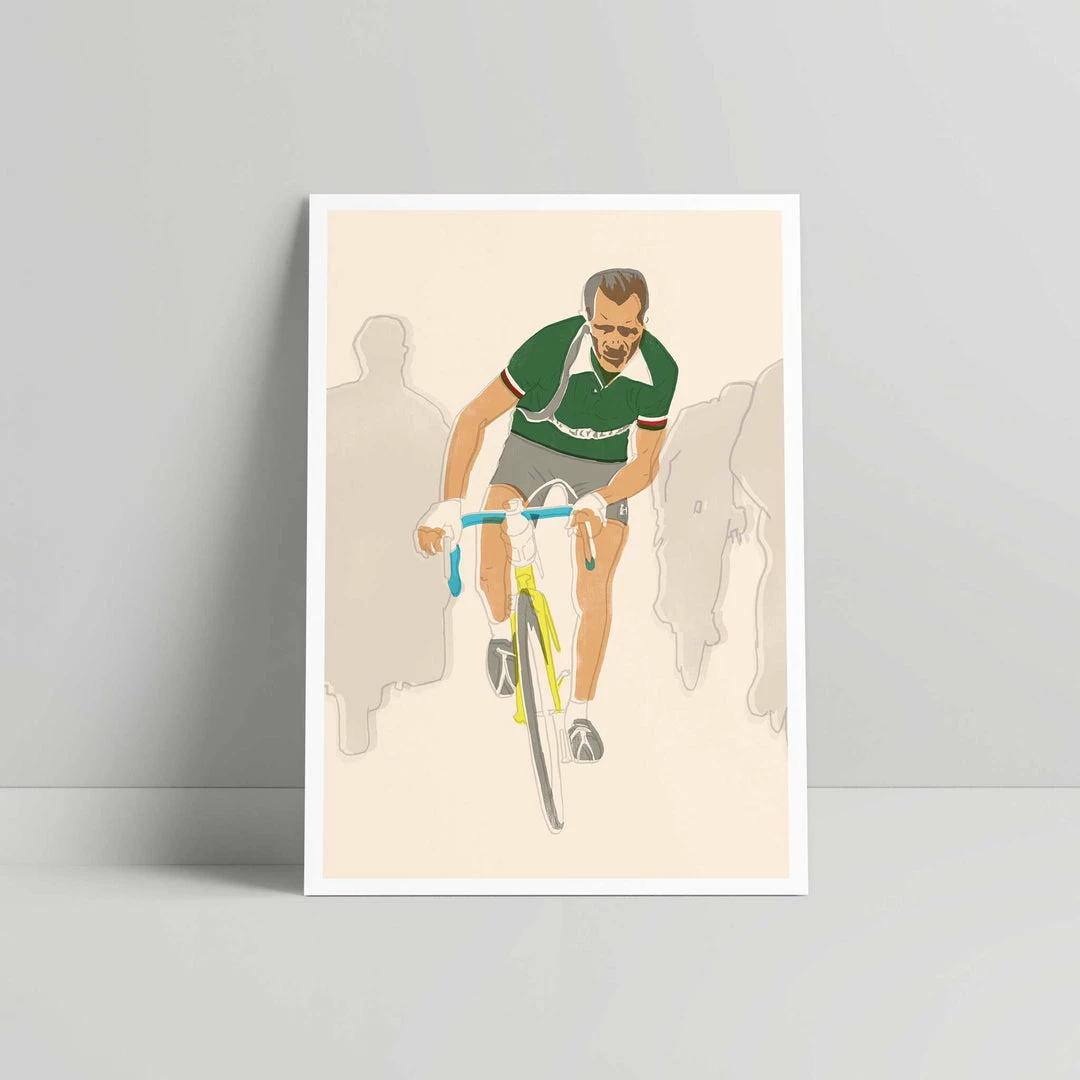 Print of En Danseuse original illustration by Chris Pasche. Out of the saddle, leaning forward, on the hoods, for that extra burst of power to dance up that hill or sprint on the flat – En Danseuse.