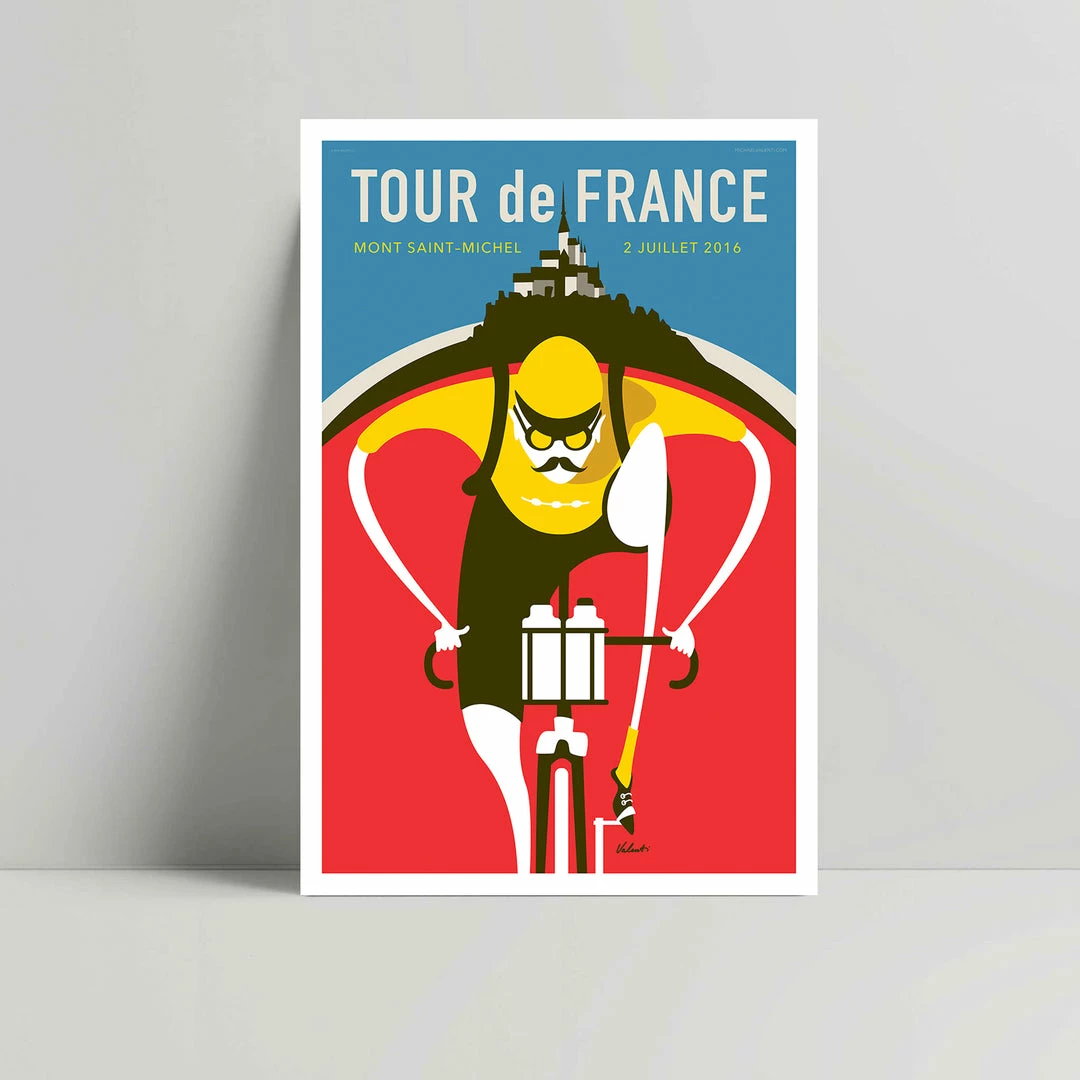 My vintage flavored drawing of this poster uses the Red, White and Blue of the French flag along with the βMaillot Jauneβ β Yellow Jersey. Complete with goggles, a spare tire and of course a handlebar mustache our cyclist represents the romantic era of the Tour de France classic days of cycling.