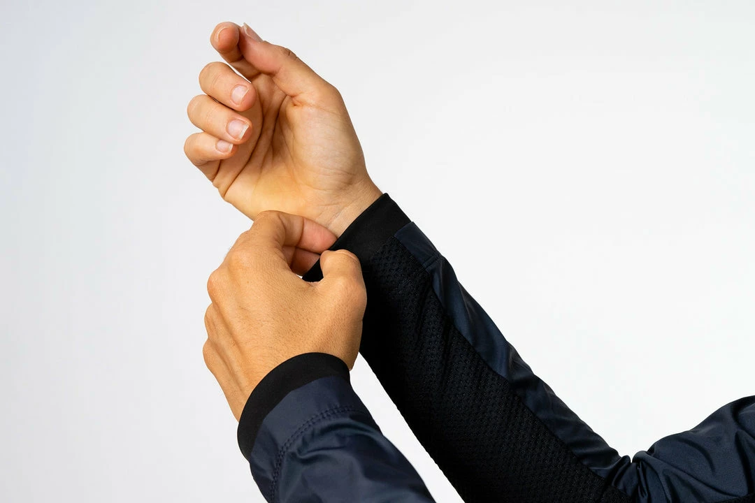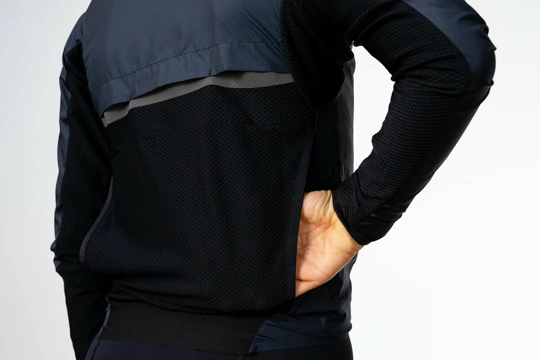 También incorporamos tejido reforzado con elástico en la parte del cuello, consiguiendo así una mayor adaptabilidad y ergonomía al cuerpo, lo que permite una usabilidad óptima de la prenda. Esto se suma a sus aperturas laterales, perfectamente colocadas para acceder a los bolsillos del maillot sin necesidad de quitarte la prenda.