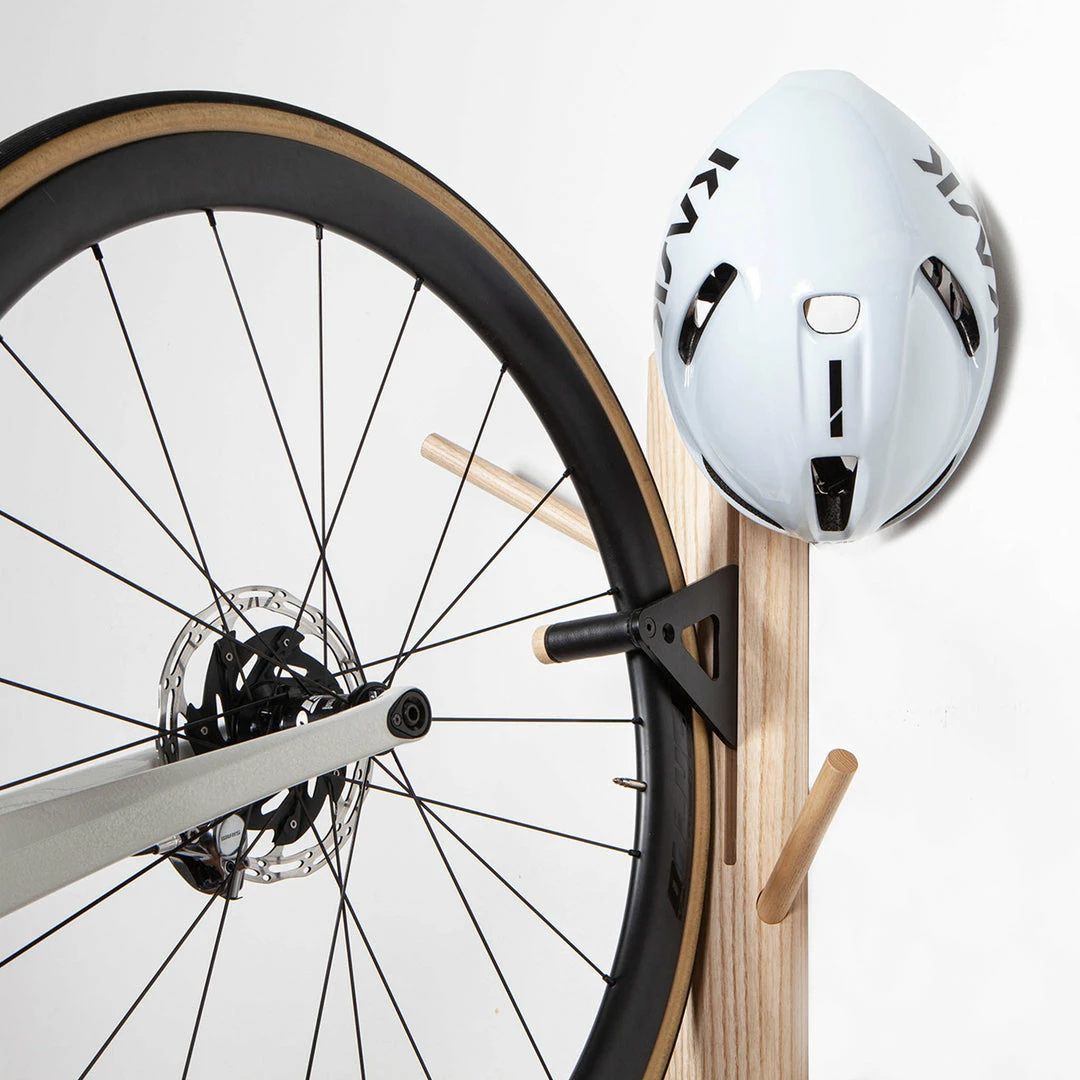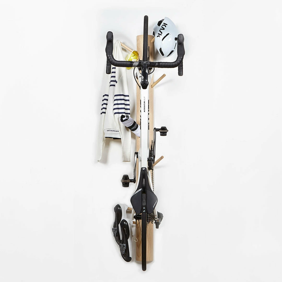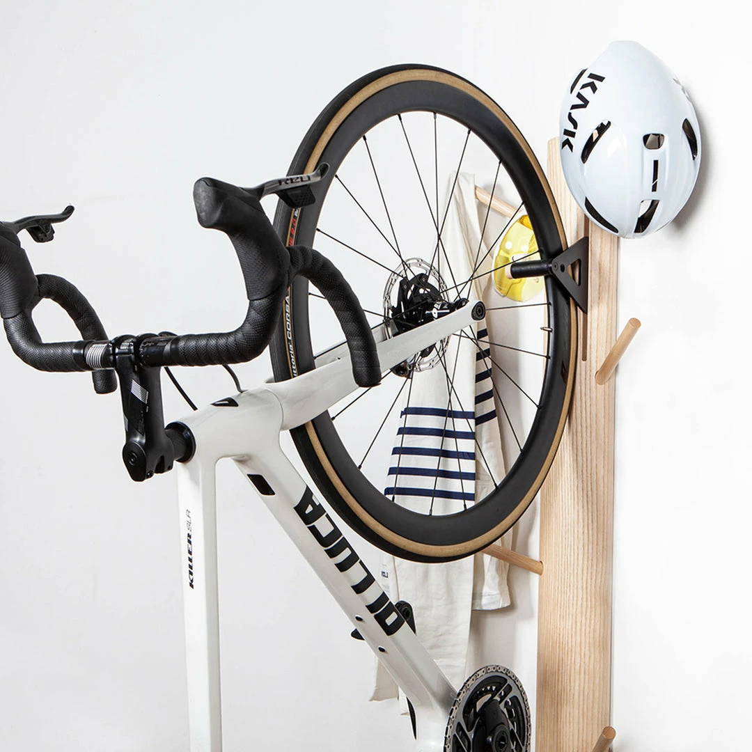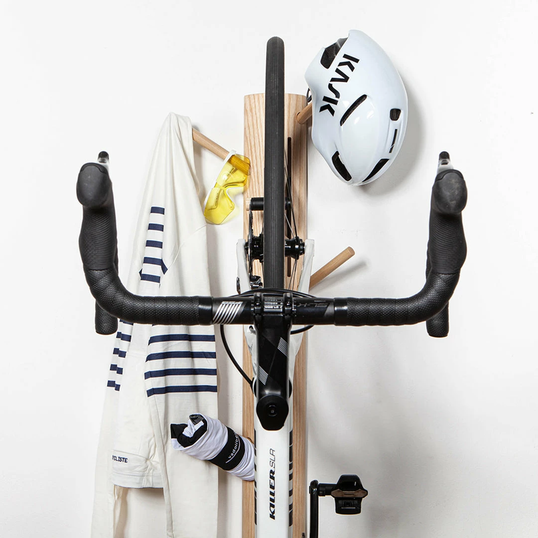 Sleek and simple, it’s an organic design piece with a great aesthetic impact. It recalls the shape of a tree, featuring a rounded solid matte ash wood trunk that hosts the bike, and seven branches on the sides for the gear: each one has been designed to fit and hang all cycling accessories (and more).
