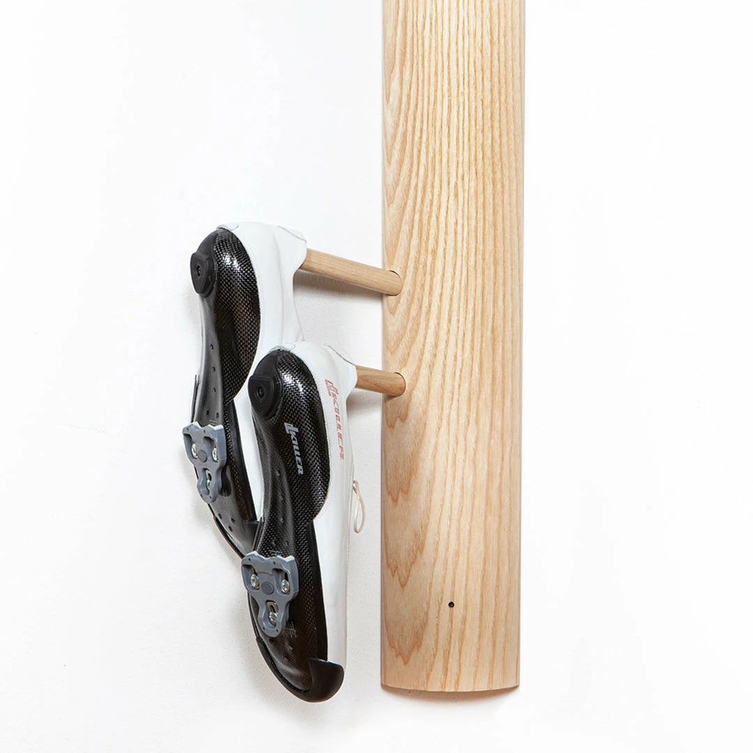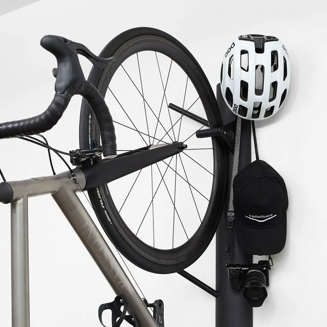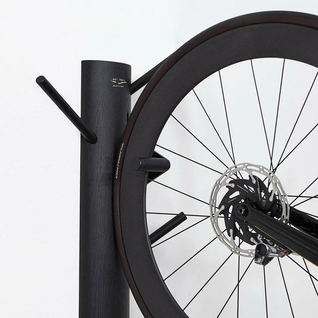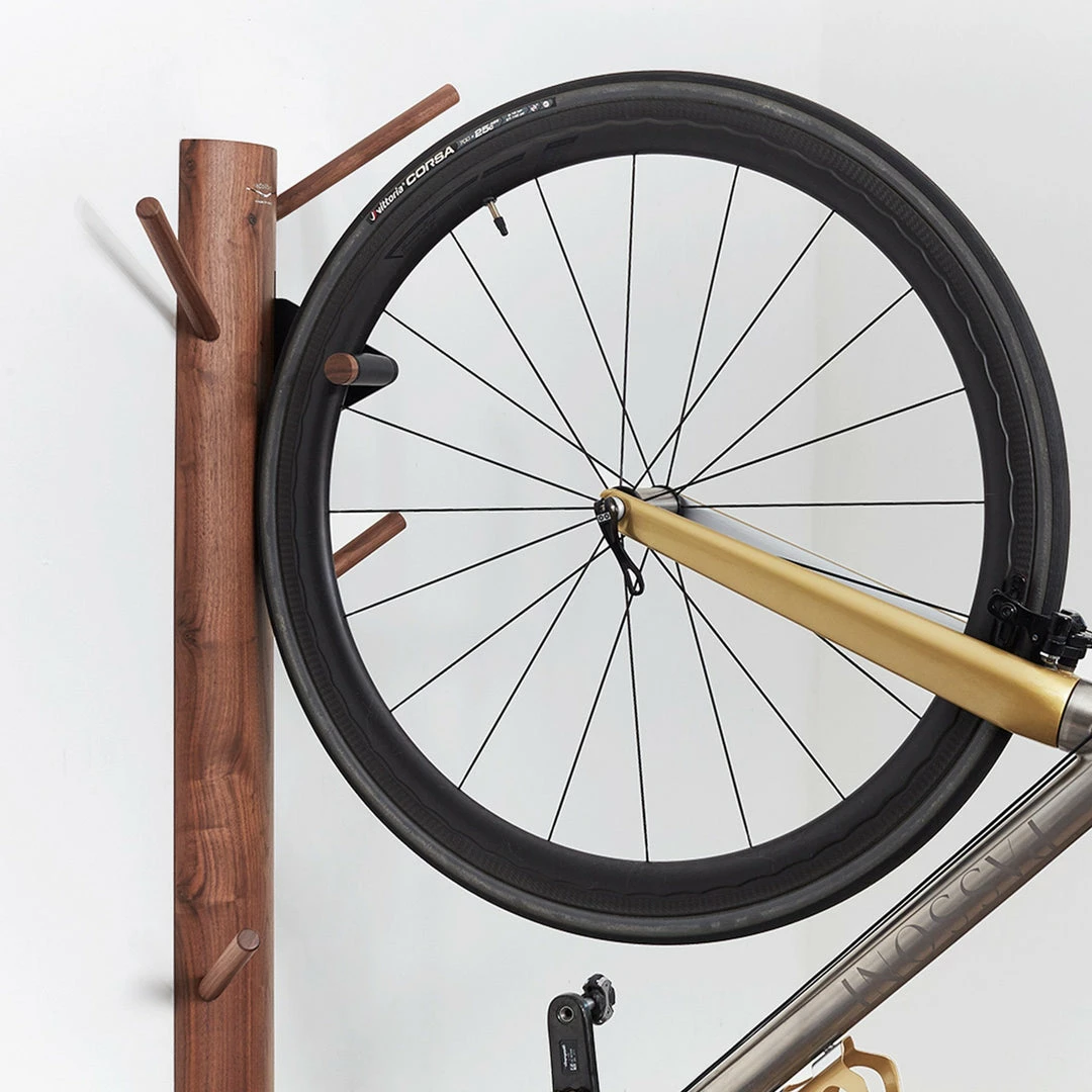 Sleek and simple, it’s an organic design piece with a great aesthetic impact. It recalls the shape of a tree, featuring a rounded solid matte ash wood trunk that hosts the bike, and seven branches on the sides for the gear: each one has been designed to fit and hang all cycling accessories (and more).