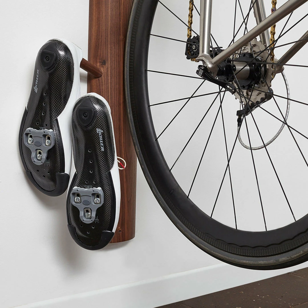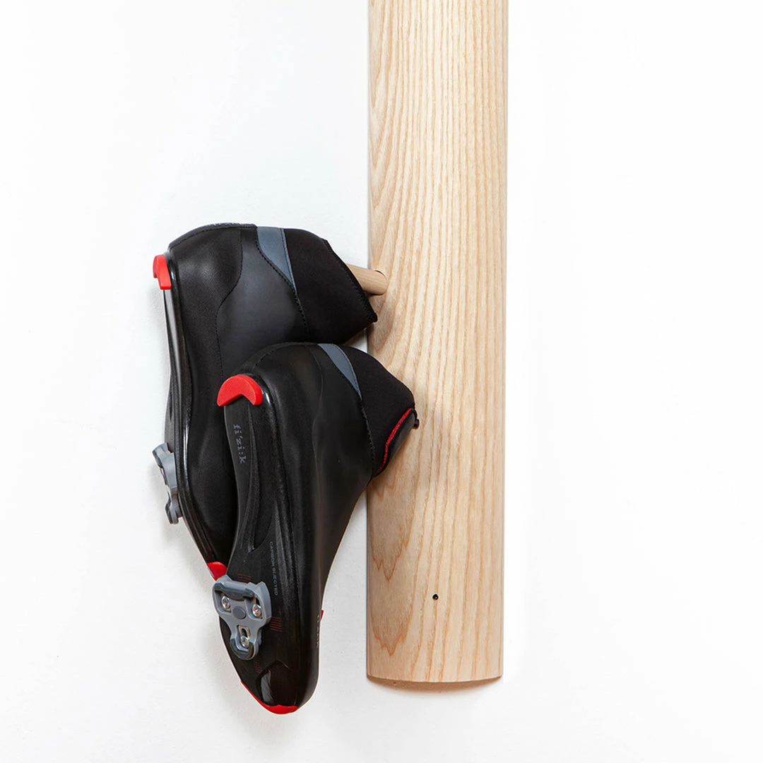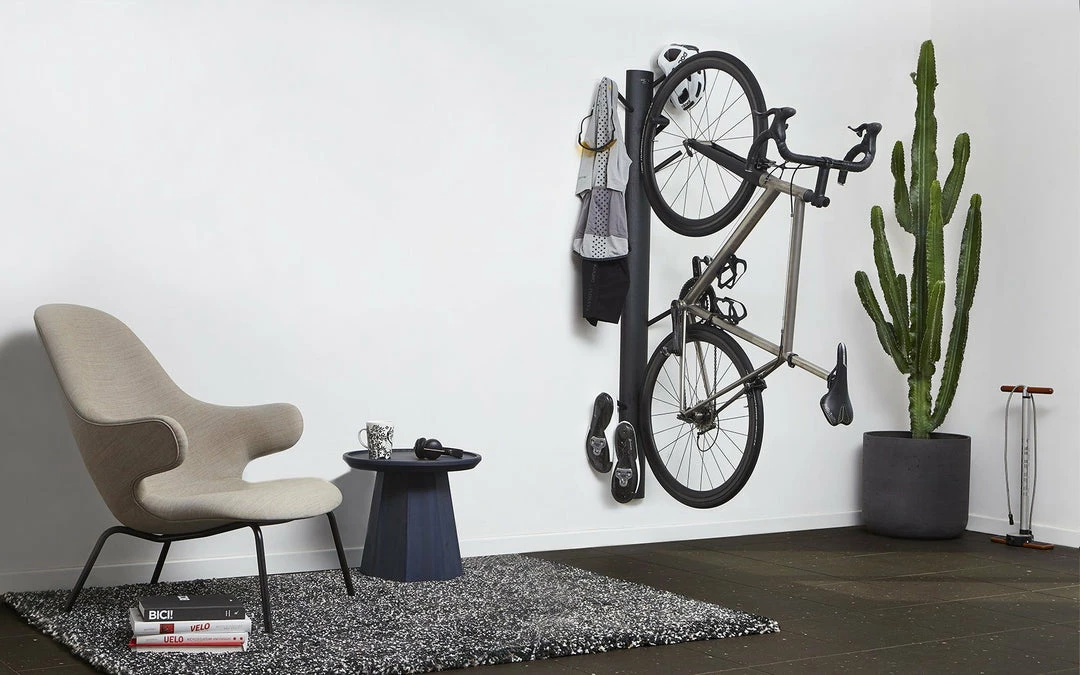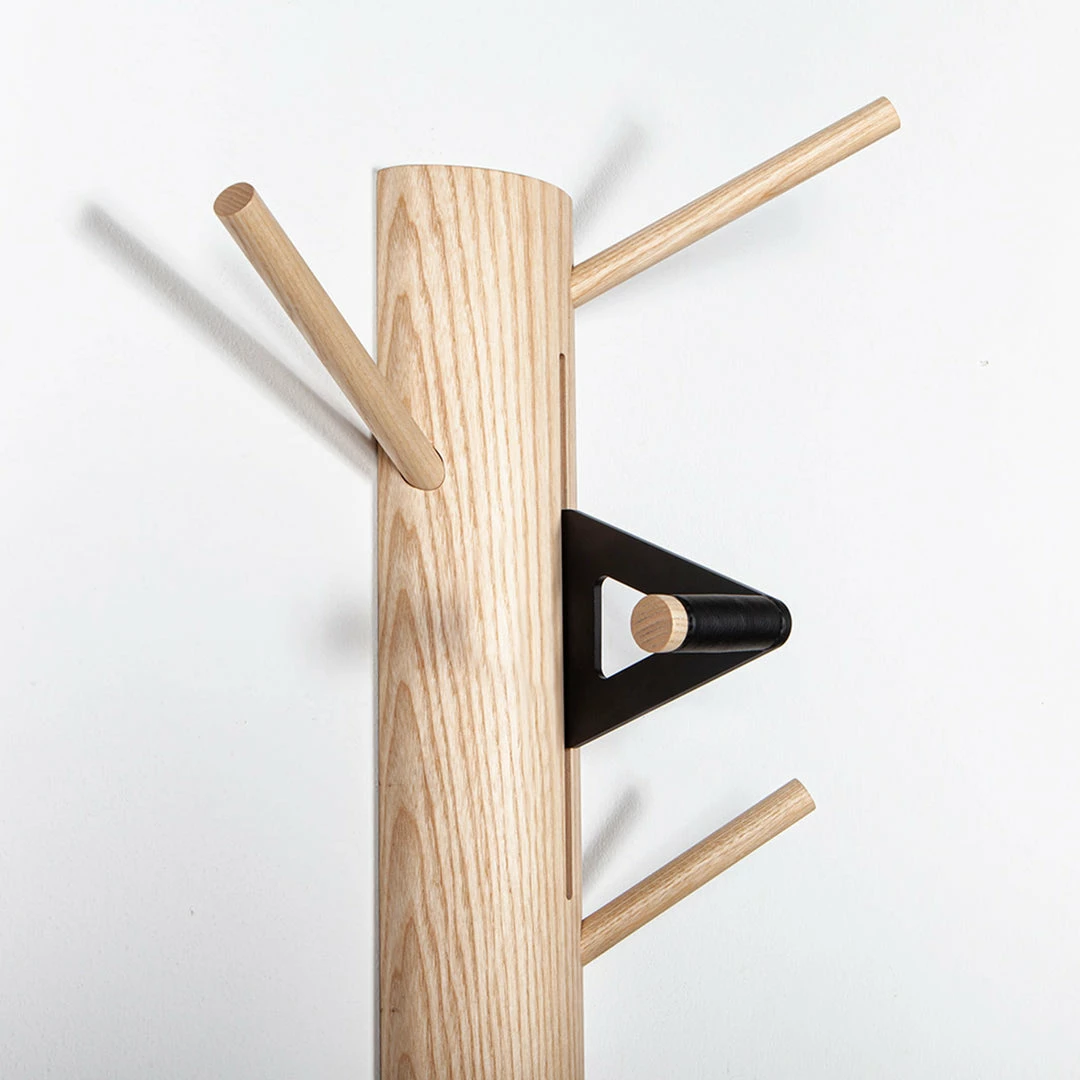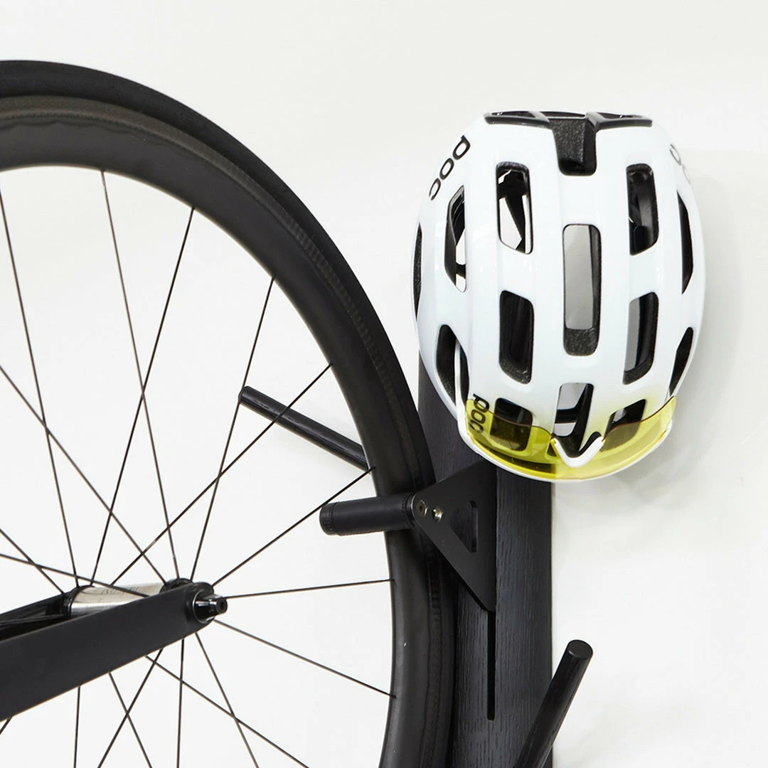 Sleek and simple, it’s an organic design piece with a great aesthetic impact. It recalls the shape of a tree, featuring a rounded solid matte ash wood trunk that hosts the bike, and seven branches on the sides for the gear: each one has been designed to fit and hang all cycling accessories (and more).