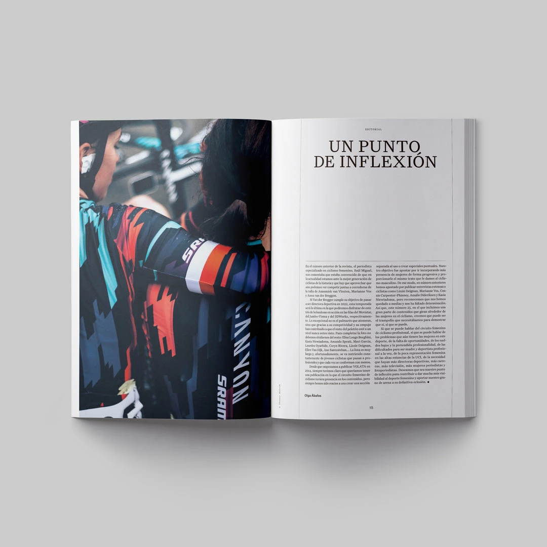 Para ello, hemos preparado un dosier central con una entrevista en profundidad a Mavi GarcΓa (AlΓ© BTC Ljubljiana), una intensa charla a cuatro entre Orla Chennaoui (Eurosport), Fran Millar (ex CEO de Sky e Ineos), Lizzie Deignan (Trek-Segafredo) y Monica Santini (CEO de Santini), reportajes sobre sobre mujeres ciclistas en PakistΓ‘n, cirugΓa labial femenina y una retrospectiva sobre la prohibiciΓ³n de las mujeres de participar en la caravana del Tour, asΓ como textos de Marianne Vos y la periodista y escritora Laura Meseguer, a quien incorporamos como columnista. Y ademΓ‘s: MarΓa PajΓ³n, Lael Wilcox, ClΓ udia GalΓcia, Colette, Ashleigh Moolman-Pasio, La Fuga: la Traka 360… y la magnΓfica portada de la ilustradora Adara SΓ‘nchez, inspirada en la escapada de Mavi GarcΓa en la Strade Bianche de 2020.