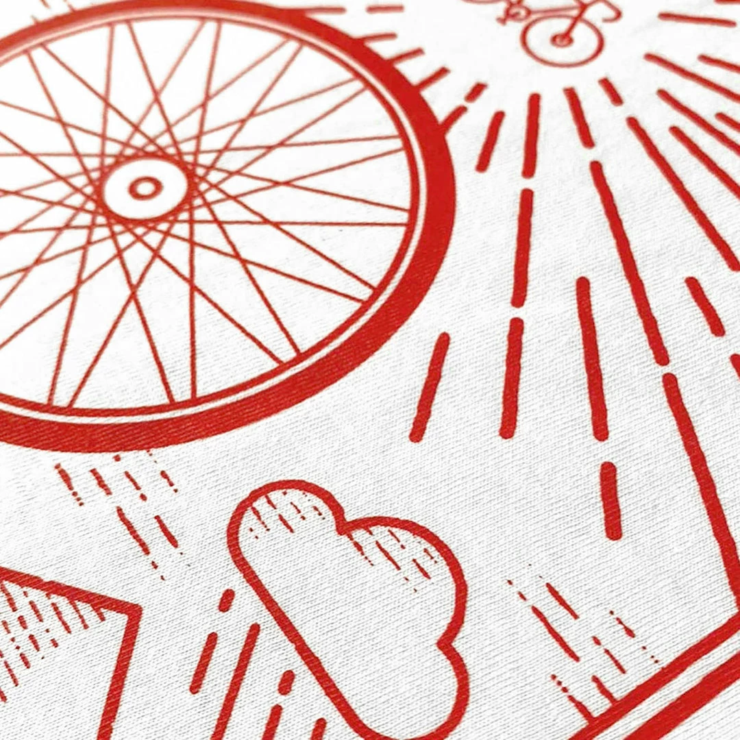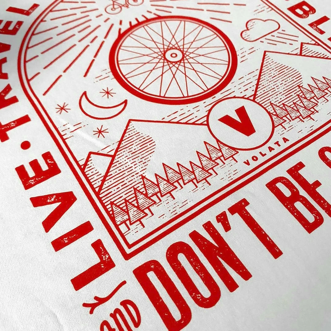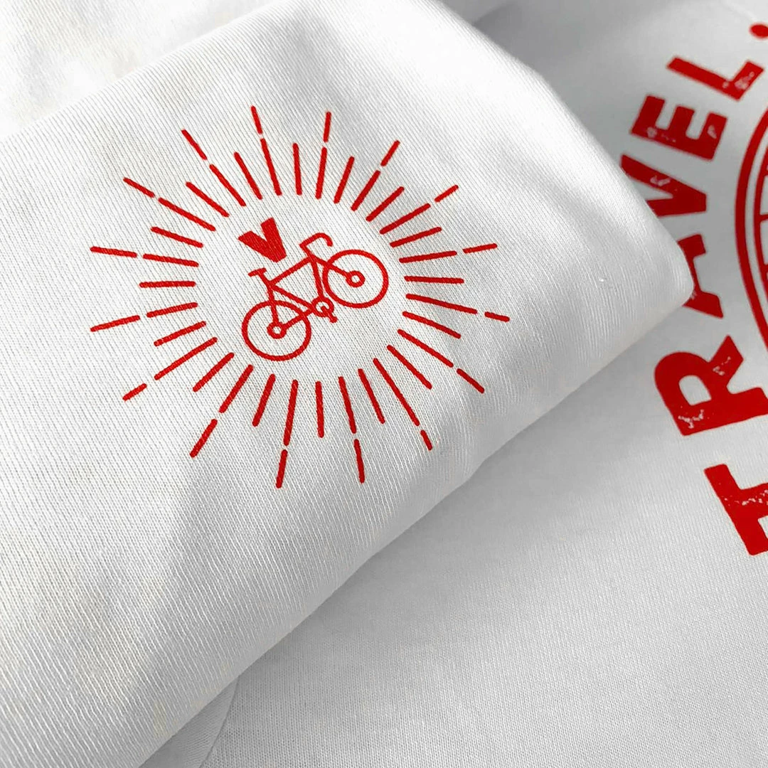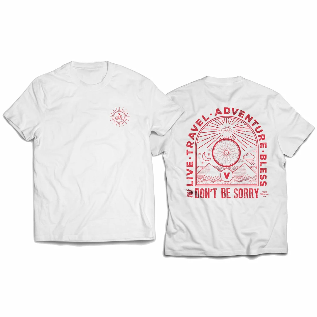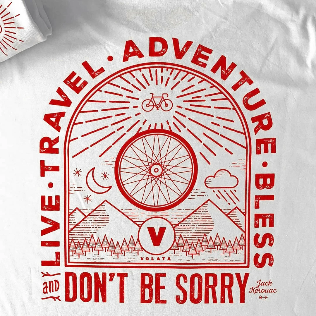 Creemos que esta frase del escritor Jack Kerouac se merecรญa una camiseta: “Live, travel, adventure, bless and don’t be sorry”. Asรญ que la hemos estampado en rojo en la parte de la espalda a travรฉs de serigrafรญa manual sobre tejido de algodรณn 100% orgรกnico. Impresiรณn con laca orgรกnica, a cargo del taller 43 Hilos, de Barcelona. En el pecho, un pequeรฑo detalle con la bicicleta como protagonista. Esperamos que os inspire para vuestra prรณxima aventura sobre ruedas.